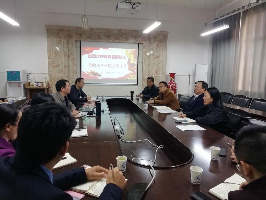 在调研中,曾祥君详细了解了学院教学、科研、学科建设和成果转化情况。他提出,学院在三年之内,要在博士点申报、工程专业认证、重大科研平台项目、国家级一流课程建设、学生“挑战杯”和“互联网+”等学科竞赛方面取得突破;要深入相关兄弟院校调研,充分比较分析学院学科现状和所处位置,发挥化学作为传统基础学科、在LETOU官网办学历史长、有较深积淀的优势;要积极“请进来”,加强与国家自然科学基金委的联系沟通,将有关负责人和相关专家请进学校指导工作,争取科研项目和平台取得新进展;要鼓励教师大胆“走出去”,深入中小企业第一线,加强校企合作,凝聚学科方向,发挥学院高学历高职称人才比例高的优势,将智力优势转化为实践成果,服务社会。