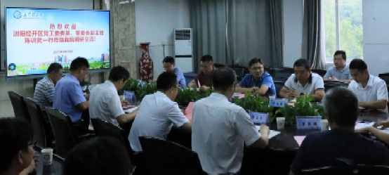 8月30日下午,浏阳市经济技术开发区党工委党工委委员、管委会副主任陈训武、管委会经济合作局局长王大辉、湖南金阳集团有限公司党委副书记、副总经理方永强、管委会经济合作局副局长李亮一行来学院调研。学院党委书记宋刘斌、副院长(主持工作)张跃飞陪同参观调研。陈训武副主任一行先后参观了细胞化学湖南省重点实验室,化学化工学院分析测试中心。随后在工三B318会议室进行了产学研对接座谈交流,座谈会由学院党委书记宋刘斌主持,副院长(主持工作)张跃飞、副院长卿志和、陈启杰及部分学院科研骨干教师参加了座谈会。