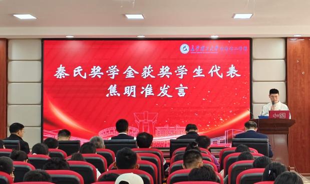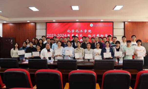 2024年11月12日下午,化学化工学院于工科三号楼A320举行2023-2024学年秦氏、旭川奖助学金颁奖仪式。杰出校友广东金天擎化工科技有限公司董事长秦保国先生、化学化工学院党委书记宋刘斌、院长张跃飞、党委副书记、副院长李家春、副院长陈启杰、学工办老师、轻化工程系教师代表、获奖学生及2024级轻化工程专业学生参加了颁奖仪式。