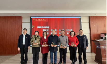 大会分为四项议程,第一项议程为2024年度教职工荣休仪式,全体院领导为周琼花、肖忠良、龙姝等8位荣休教师现场颁发纪念牌并合影留念。肖忠良教授作为荣休教师代表进行了发言,他深情地回顾了自己在学院工作的点点滴滴,对学院日新月异的变化感慨万千。他表示,看到学院如今的蓬勃发展,内心无比欣慰,也相信在全体教职工的携手奋进下,学院定能乘风破浪,开创更加辉煌灿烂的明天。