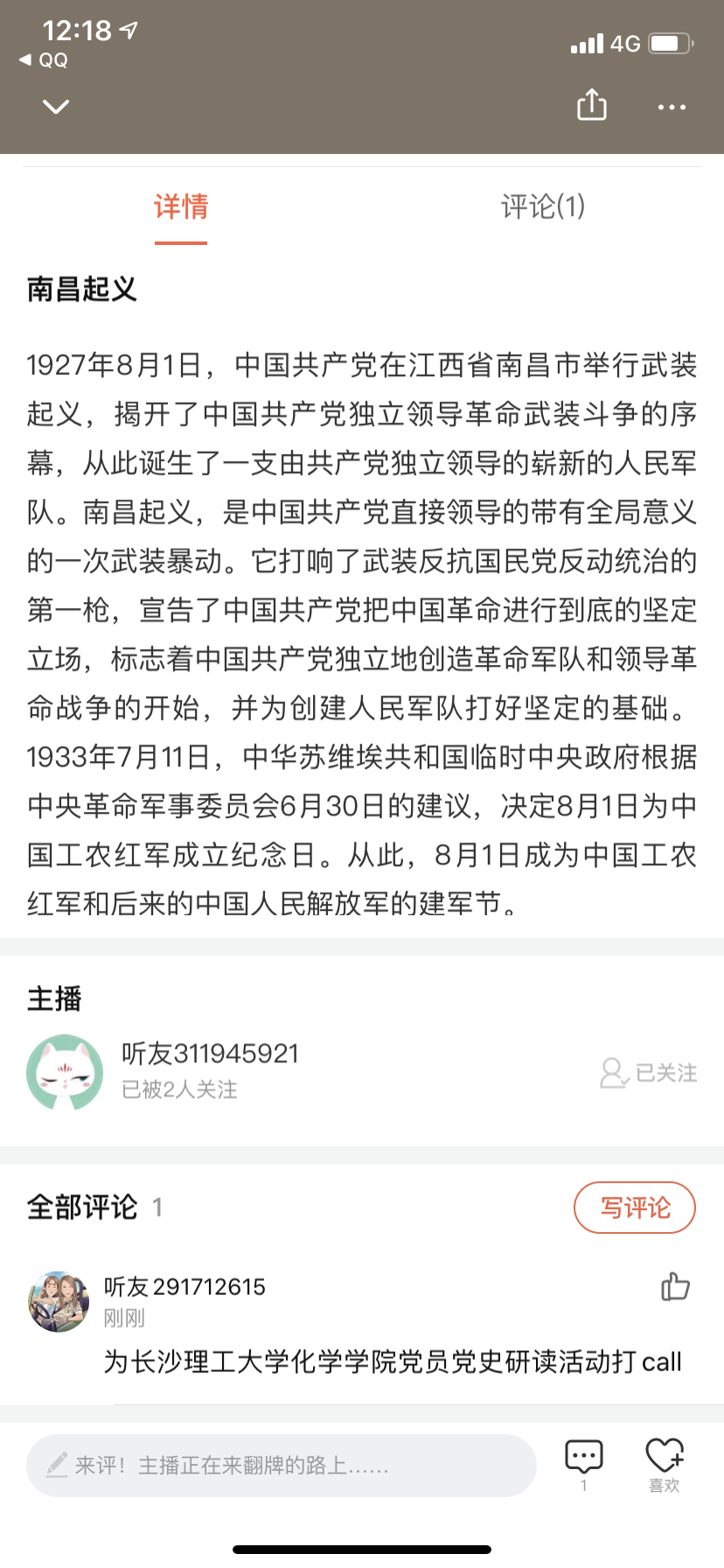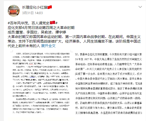 为庆祝中国共产党建党100周年,营造浓厚学党史氛围,引导学生深入学习党史,坚定理想信念,化学学院组织了“百年风华,百人诵读”党史研读活动,活动以不同时期的重大事件、会议、人物、事迹、著作为主干,全景回顾党的伟大历程和辉煌成就。3月25日-4月8日,应化本科生党支部组织开展了第一期活动,内容围绕“党的创建和大革命时期”党史知识展开,并在喜马拉雅APP、官Q上展示活动成果。