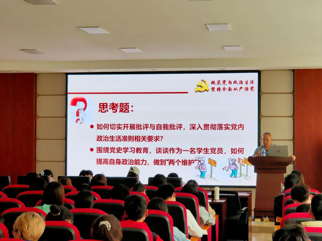 首先,邓豫以“什么是《准则》”、“为什么要学《准则》”、“怎么学《准则》”三个问题引出此次授课内容。接着从时代背景着手,向全体学员介绍了1980年版《党内政治生活的若干准则》和《关于新形势下党内政治生活的若干准则》制定的原因,并指出《新准则》所具备的五大特点。然后结合实际详细讲解了《新准则》中“坚定理想信念”、“坚持党的基本路线”、“坚决维护党中央权威”等十二个具体条款。最后邓豫希望全体学员通过本次党课,能够深入学习党的纪律,加强自我反思,始终做到“心中有党、心中有民、心中有责、心中有戒”,并且希望全体学员以实际行动积极践行《新准则》。