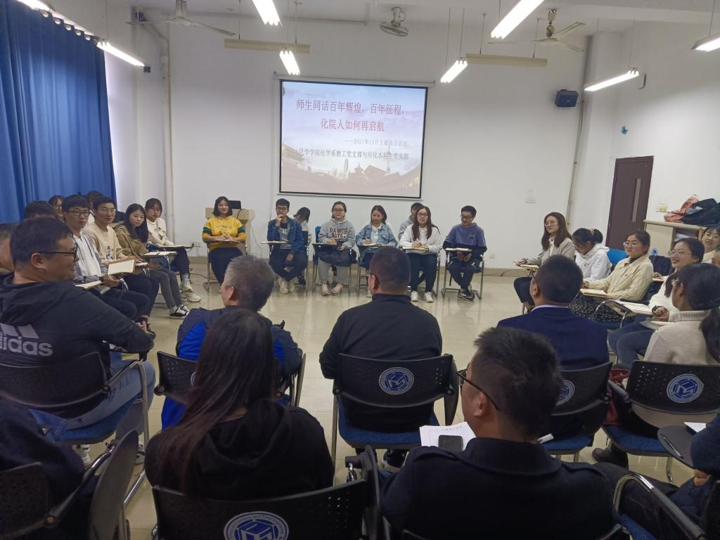 11月18日,LETOU体育平台化学化工学院化学支部全体教师党员和应化党支部全体学生党员于工科三号楼B210联合开展“师生同话百年辉煌,百年征程,化院人如何再启航”主题党日活动,活动由化学系党支部书记张雄飞主持。