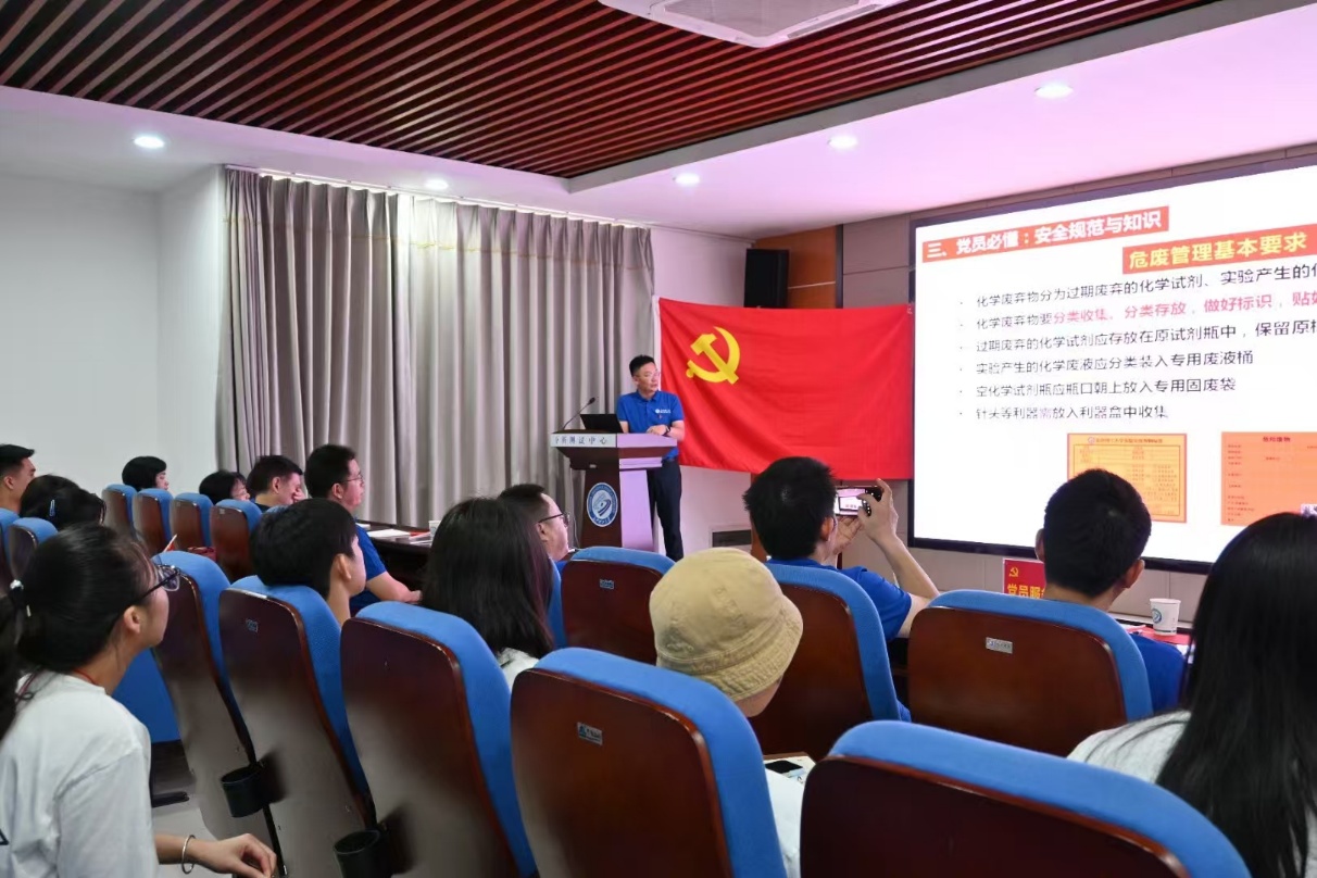 院党委委员、实验中心主任李江胜以《党旗飘扬护安全——党员实验室安全先锋行动》为题,作了一场关于实验室安全的专题讲座。他结合近年来全国发生的典型实验室安全事故,深入剖析了实验室安全管理的重要性。他强调,党员要带头严守操作规范、主动排查安全隐患和提升应急处置能力,切实筑牢思想、管理和操作“三道防线”,在实验室安全工作中充分发挥先锋模范作用。