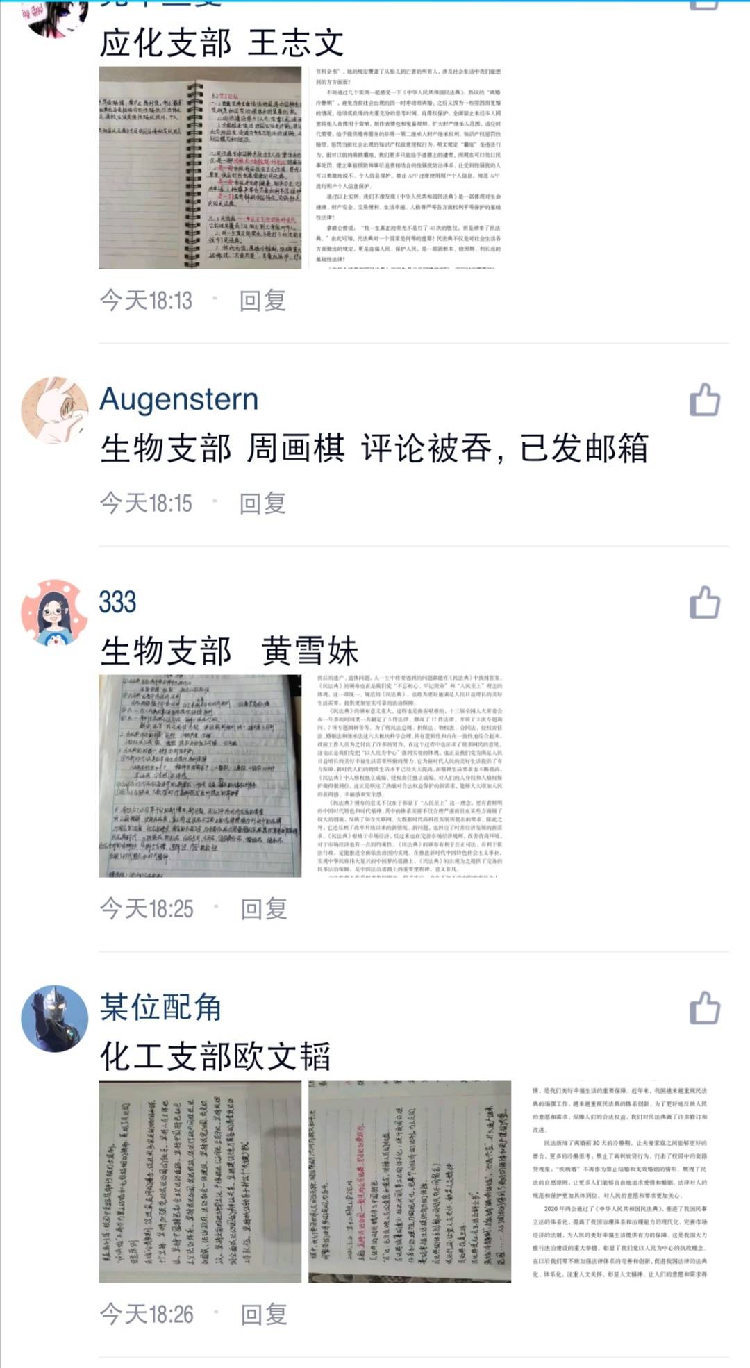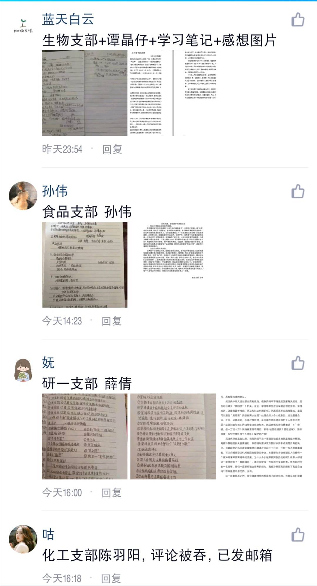 围绕民法典的时代精神与中国特色、民法典草案热词、热剧主角“现身说法”:民法典将这样改变我们的生活、民法典讲义和“十个坚持”等视频资料进行学习。资料生动阐述了《民法典》作为“社会生活的百科全书”,是新时代中国立足国情和时代需要的新创造,它的诞生将很好的保障私权和规范公权,满足全国人民美好生活的需要。深入学习后大家进行了热烈的线上讨论交流。化工支部陈蕾表示,“对个人来说,民法典是从婴儿时期起就撑在我们头顶上的伞。‘在民法慈母般的眼里,每一个人就是一整个国家’。民法典从我们还是婴儿起就伴随在我们身边,从摇篮到坟墓,各项义务权利事无巨细。”生物支部范成谈到,“法律的完善是辩证发展的,应当与当前社会相适应,决不能离开社会和人民的意愿。我们既不能盲目追求其他国家的法律标准与执行方式,也不能就此终止、止步不前,而是立足实际,不断改进。”应化支部唐思思认为,“作为当代大学生,首先务必端正自己的态度,遵守法律,心中有一杆秤,切勿跨出法律的界限。认真学习依法治国的相关理论,深入了解《民法典》的法律知识,并运用到日常生活中,学会合法保护自己的权益。”