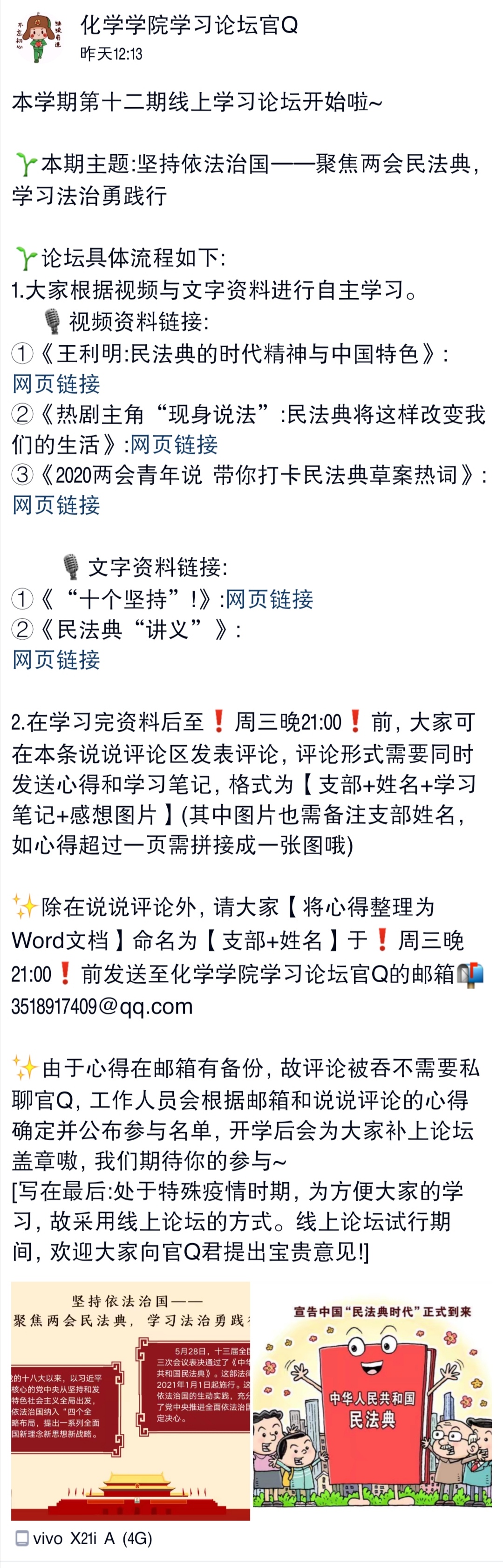 6月1日至6月3日,化学学院学生党总支通过线上发布资料的方式,举办第十二期线上学习论坛。本期主题为“坚持依法治国——聚焦两会民法典,学习法治勇践行”,共有来自九个支部的78名同志参加。