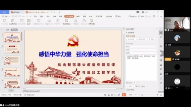 化学与食品工程学院精心设计支部书记“在线党课”,将疫情防控的生动实践与党性教育相结合。“在线党课”围绕“感悟中华力量,强化使命担当”的主题,讲好党带领人民群众战胜一次次疫情、走向一个个胜利、党旗在战疫一线高高飘扬的故事,引导广大党员在这场灾难中观察思考,充分认识社会主义制度的优越性。食品支部贺璇兮感叹道:“一场疫情,我们看到了逆向而行的医务工作者、誓死不退的解放军战士,以及无数活跃在各条战线上的党员同志,他们都是最生动形象的教材,老师的讲述也让我们更加明确了自己的身份,进一步坚定了党性。”