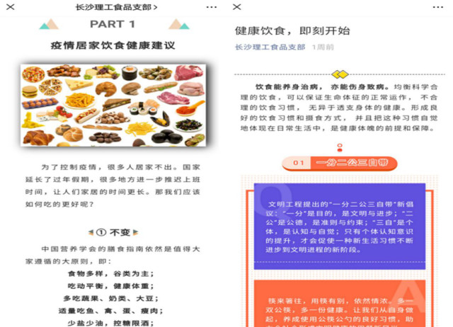 新冠肺炎疫情发生以来,化学学院一直在思考,如何利用专业服务防疫工作,学院食品本科生党支部是省级样板党支部,自2月份开始,该党支部就联合食品研究生党支部开展“新冠肺炎与食品科学营养讲堂”,打响舌尖上的保卫战。活动分为“食品安全守护者”“饮食习惯宣传者”“小小食品营养家”三个部分。