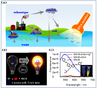 杨荣华教授课题组长期致力于生化传感新原理,及在环境污染、食品安全、生命科学等领域应用的研究。近来,课题组获得了一种DNA构型高特异性的咔唑衍生物(ethyl-4-[3,6-bis(1-methyl-4-vinylpyridium iodine)-9H-carbazol -9-yl)] butanoate,EBCB),结合汞离子诱导DNA构型转换及荧光信号开关,实现了汞离子的高效光学分析,研究工作发表在《Environmental Science & Technology》上。该方法操作简单、响应快速(30 s)、检测限低(0.82 nM)。通过实际样品分析,证明该技术对环境水样具有很好的检测实用性,有望为汞污染的高效监测提供新的手段、为生态保护和人类健康作出贡献。