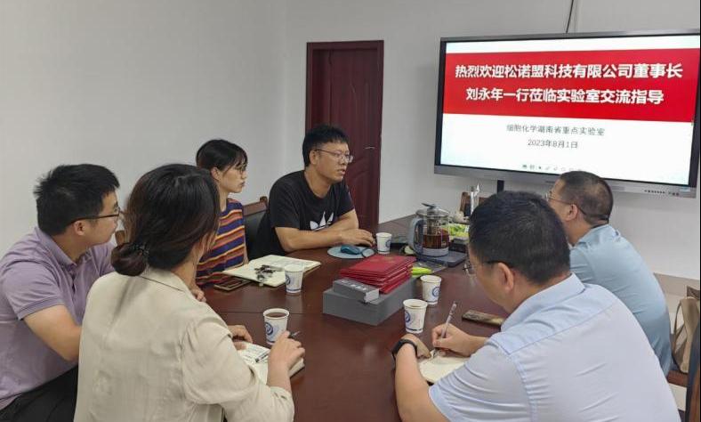2023年8月1日下午,松诺盟科技有限公司董事长刘永年一行莅临细胞化学湖南省重点实验室交流和指导。会议由化学化工学院副院长、细胞化学湖南省重点实验室常务副主任、健康化学湖南省普通高等学校科技创新团队带头人卿志和教授主持,实验室教师代表参加了此次交流讨论会议。