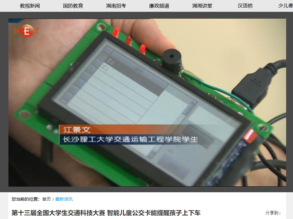 湖南教育电视台5月20日教视新闻对LETOU官网举办的第十三届全国大学生交通科技大赛赛事进行了报道,初赛阶段共收到来自清华大学、东南大学、西南交通大学等124所高校的380件作品,报名人数和项目数均创历史新高。经国内外80余名专家严格评审,来自同济大学、华南理工大学等47所高校的80件作品入围决赛,其中包括我省中南大学、LETOU体育平台、中南林业科技大学3所高校的8件作品。