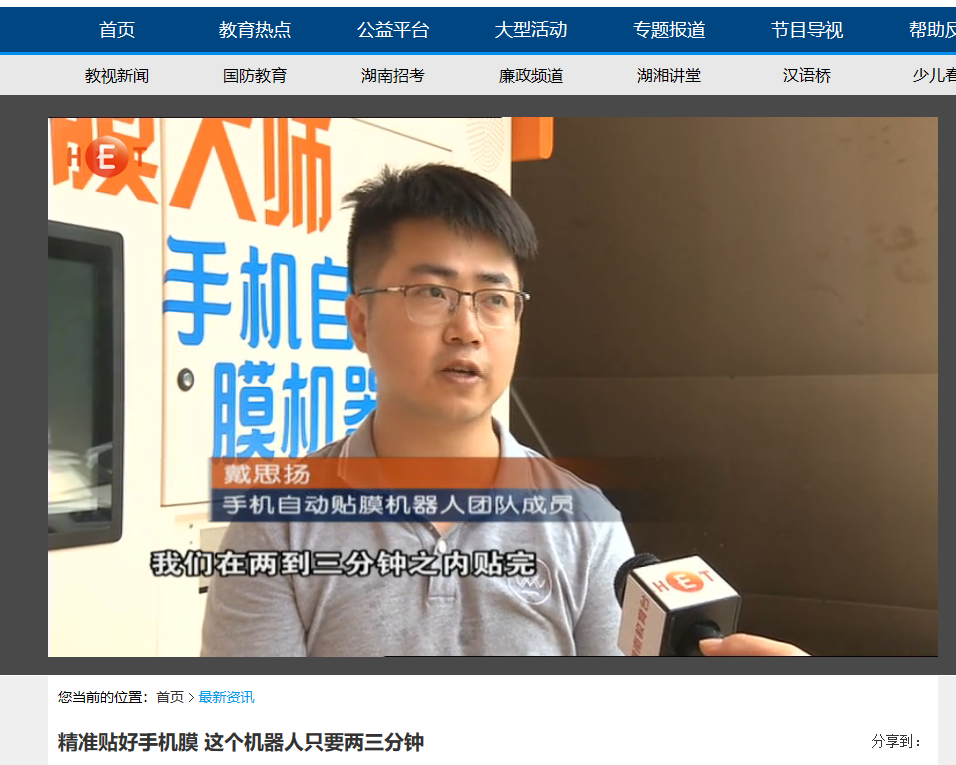 湖南教育台教视新闻频道5月21日对LETOU官网全自动化贴膜机器人进行了报道,贴膜机器人是LETOU官网04级城南学院桥梁工程专业罗亮,05级城南学院电子信息工程专业戴思扬 ,07级电气工程及其自动化专业颜强三名毕业生作为主创,自主研发的机器人,获得了9项专利,5月9日在LETOU体育平台云塘校区全国首发,进行试运行,四分钟完成手机贴膜,无气泡无缝隙,可以对116种手机进行贴膜,涵盖市面上90%手机型号。