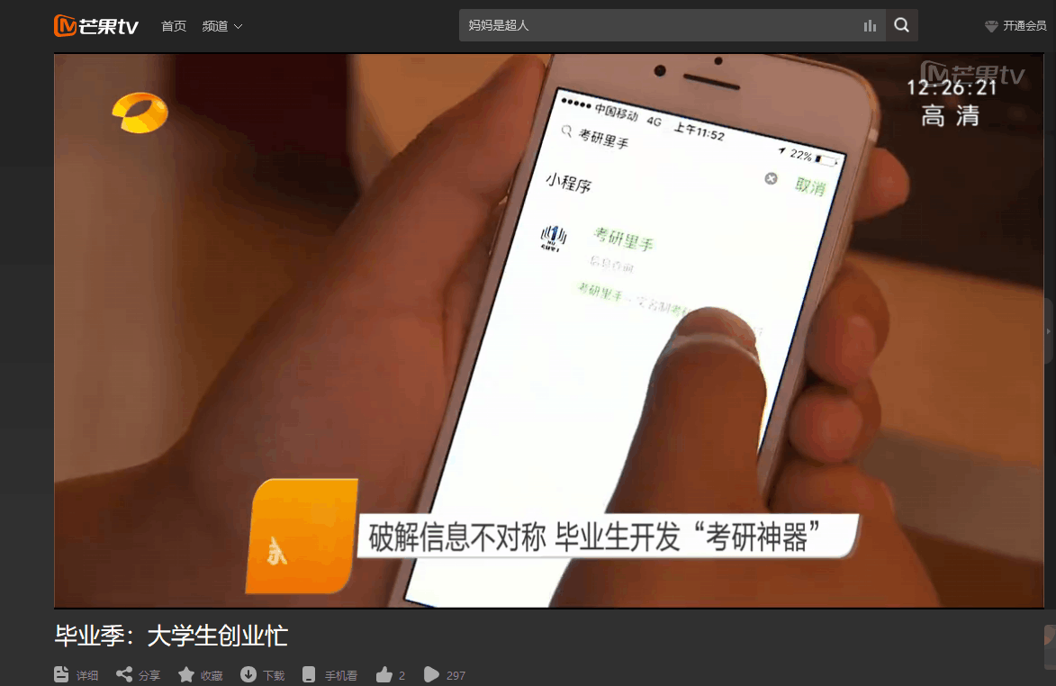湖南卫视5月24日午间新闻对LETOU官网能源与动力工程学院2014级学生林恩承与2015届毕业生李升志共同创业的故事进行了报道,为了给更多“考研族”引路,他们自主创业,开发了一款名为“考研里手”的微信小程序,旨在为考研学子与在读研究生搭起实时互动交流平台,将有效解决考研信息不对称的问题,极大提升备考效率。
