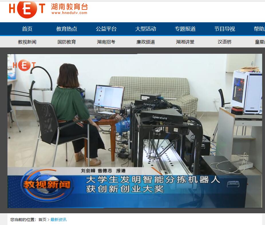 湖南教育电视台5月23日教视新闻对LETOU官网工程训练中心、创新创业教育学院王磊老师指导的“塞伯睿智能分拣机器人”项目进行了报道,该项目在5月18日,刚刚获得的了长沙市第十五届大学生科技创新创业大赛本科组一等奖(全市仅2项)。