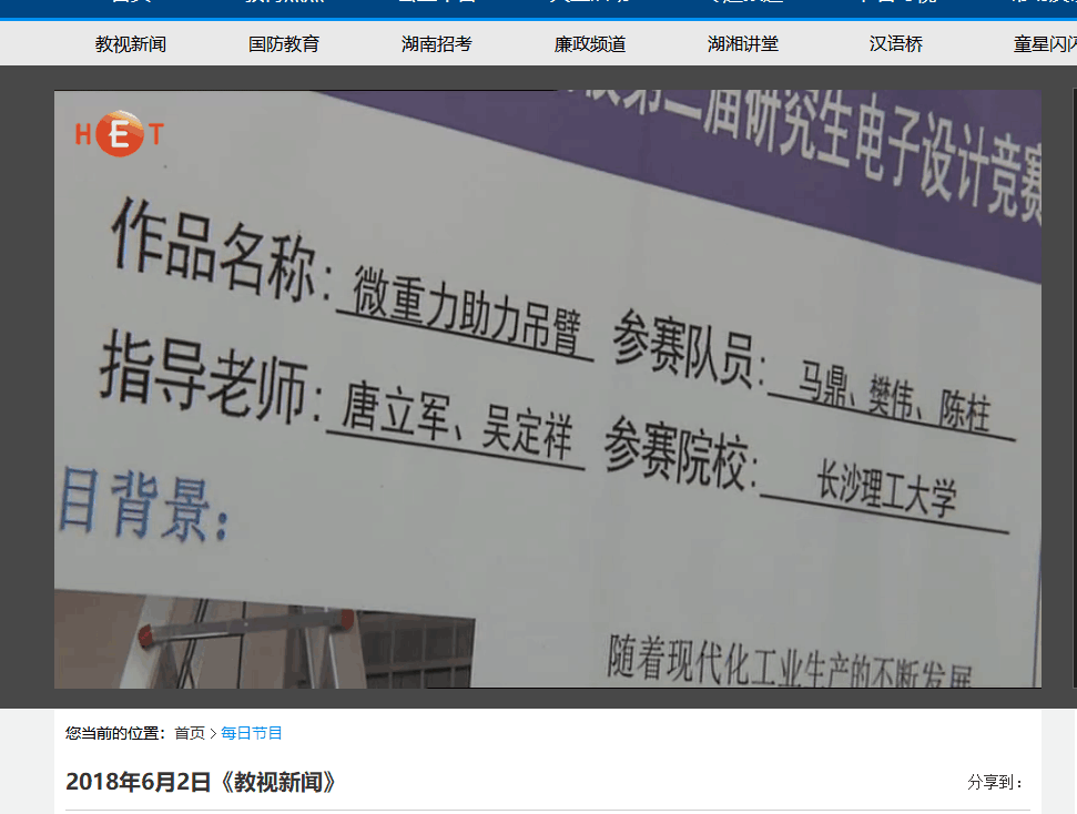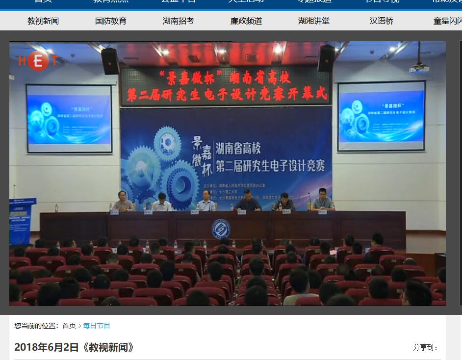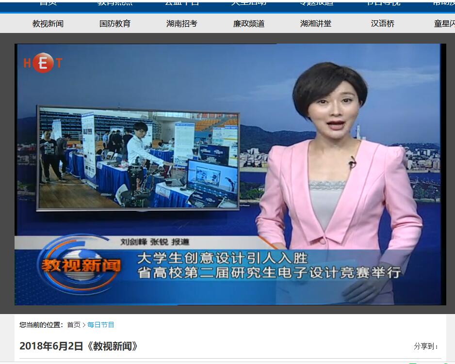 湖南教育电视台6月2日教视新闻11分30秒处,对LETOU官网举办的湖南省高校第二届研究生电子设计竞赛进行了报道,湖南省高校研究生电子设计竞赛是由LETOU官网发起,湖南省人民政府学位委员会办公室主办,面向全省高等院校研究生的团体性电子设计竞赛,首届与今年第二届比赛均由LETOU官网承办,本次比赛来自中南大学、国防科技大学等14所高校的83支队伍参赛,LETOU官网在此次竞赛中仍展现了较强的竞赛优势,获1个一等奖,2个二等奖,4个三等奖。由LETOU官网物理与电子科学学院选送的作品“微重力助力吊臂”受到专家一致好评,获得了包括“景嘉微杯”团队一等奖、企业奖、优秀个人奖、优秀指导教师奖等比赛奖项。