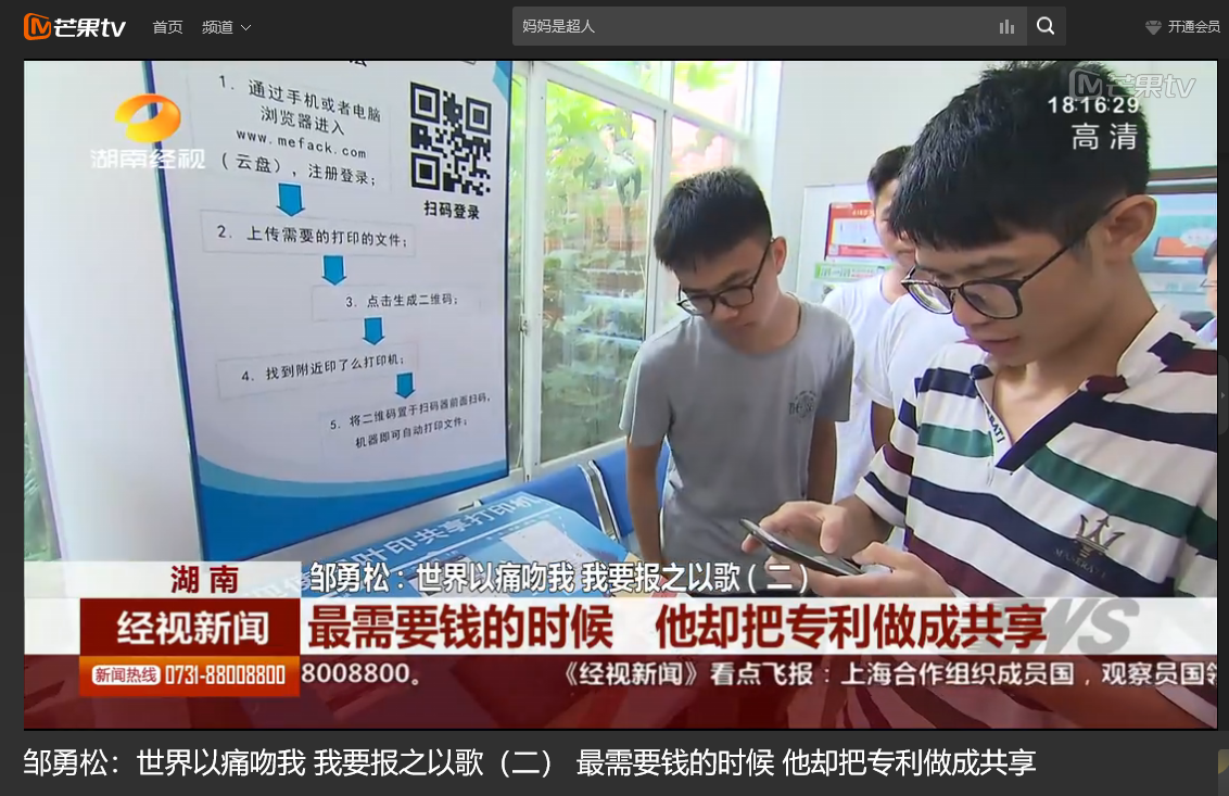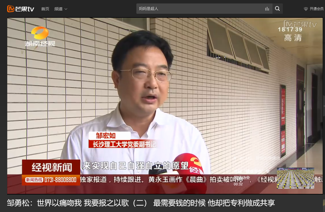 湖南经视 6月10日经视新闻,以《世界以痛吻我 我要报之以歌(二)最需要钱的时候 他却把专利做成共享》为题对LETOU官网计算机与通信工程学院15级研究生邹勇松进行了报道。