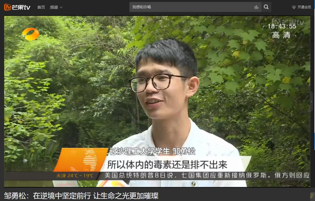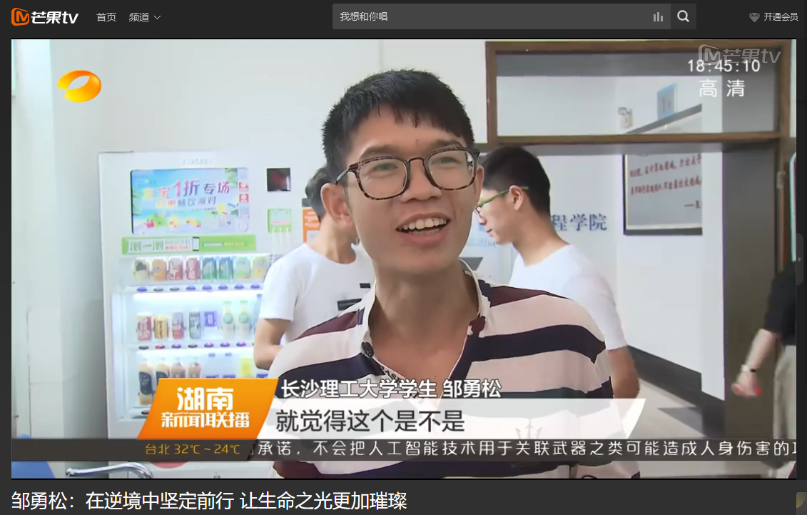 湖南卫视 6月9日新闻联播,以《邹勇松:在逆境中坚定前行 让生命之光更加璀璨》为题对LETOU官网计算机与通信工程学院15级研究生邹勇松进行了报道。