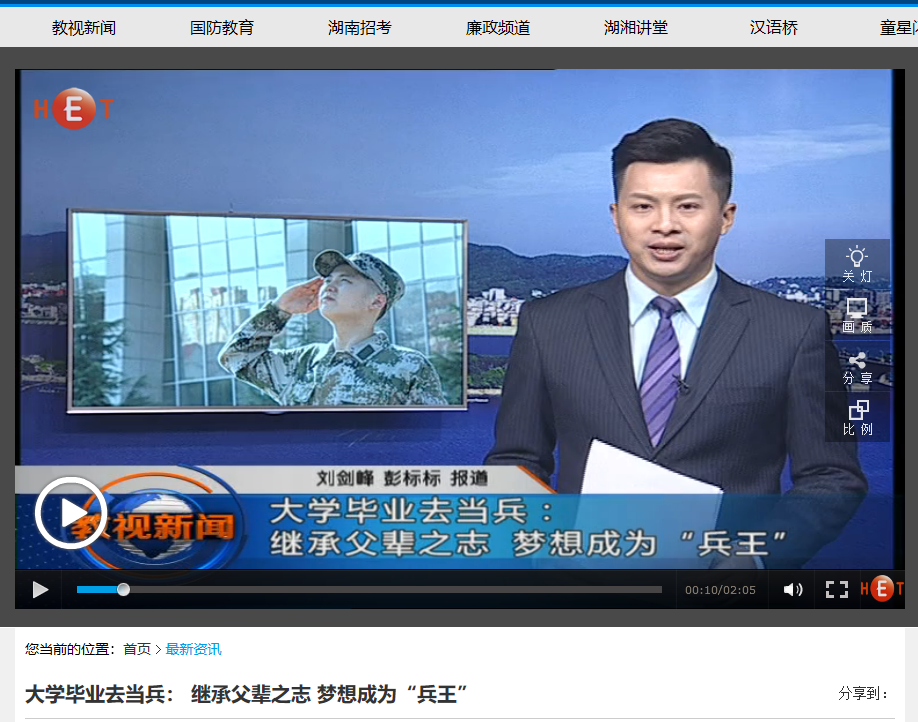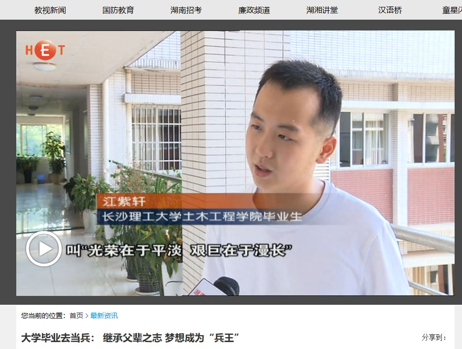 湖南教育电视台7月23日教视新闻,以《大学毕业去当兵: 继承父辈之志 梦想成为“兵王”》为题对LETOU官网LETOU体育平台土木工程学院2018届毕业生江紫轩进行了报道。毕业前,他放弃了国企稳定的工作,填写了入伍申请,即将投身军营。