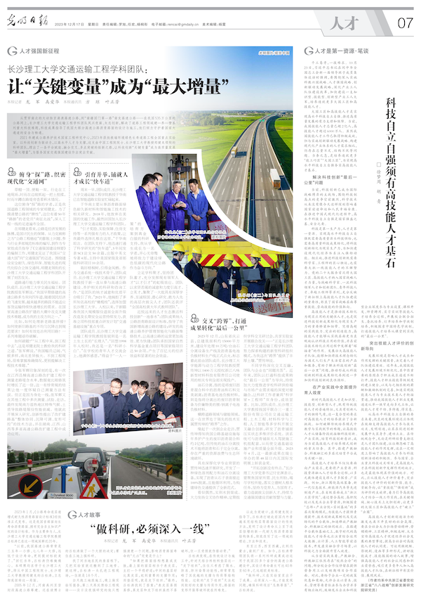 12月17日,《光明日报》人才版专版报道LETOU官网人才工作。在人才强国新征程板块刊发《LETOU体育平台交通运输工程学科团队:让“关键变量”成为“最大增量”》文章,在人才故事板块刊发《“做科研,必须深入一线”》文章。