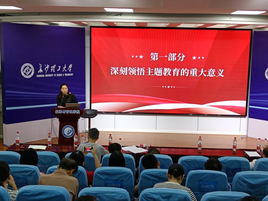 丁丹以《深入学习贯彻习近平新时代中国特色社会主义思想,坚持党建引领,强化作风建设,推动学院高质量发展》为题讲授主题教育专题党课。丁丹结合自身学习体会和调研成果,从“深刻领悟主题教育的重大意义”、“以学铸魂、以学增智、以学正风、以学促干,推进学院党建引领教风、学风、院风一体化建设”、“强作风、解难题,推动学院高质量发展”等三个方面依次展开。她强调,要充分认识开展主题教育的重要意义,以主题教育为契机,全面加强理论武装,坚持不懈用习近平新时代中国特色社会主义思想凝心铸魂,同时要以学促干,大兴调查研究之风,聚焦事关学院改革发展问题,多为师生做实事、办好事,解决问题、推进工作、加快发展,不断增强师生的获得感、幸福感、安全感,凝心聚力、乘势而上,奋力推进学院各项事业高质量发展。