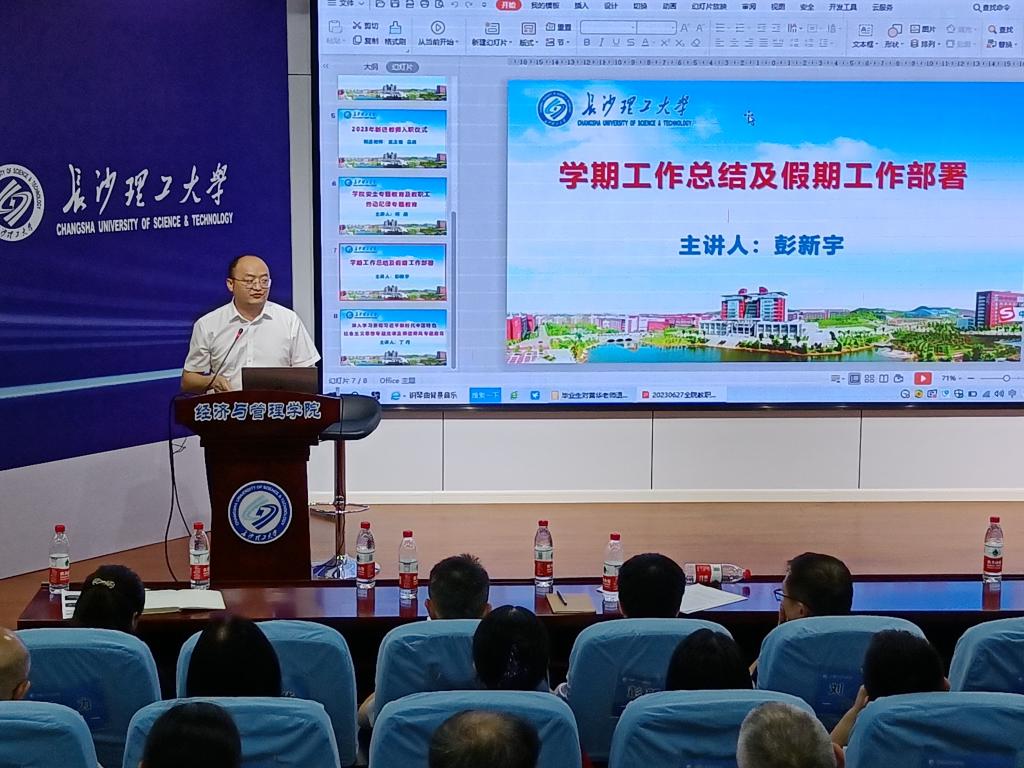 6月27日,经管学院在12教200召开2023年春季学期全体教师大会,深入推进主题教育落实落细,全面总结本学期工作,促推学院高质量发展。院党委书记丁丹,副院长(主持工作)彭新宇,副院长张新华、王治、何昊,副院长(挂职)朱锐及全体教职工参会,会议由院党委副书记唐青主持。