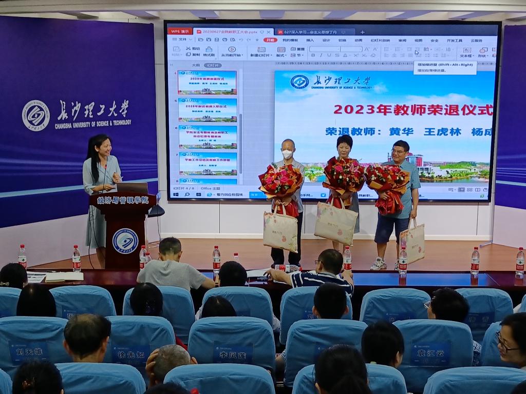 专题报告后,学院分别为5月以来的3位退休老师和2位新入职老师举行了荣退仪式和新教工入职仪式。5月以来,学院先后有王虎宁、黄华、杨成炎等3位老师退休,3位老师所在系的教师代表为退休老师敬献鲜花并送上祝福,丁丹、朱锐代表学院为他们送上蛋糕和纪念品,现场还播放了由学院学生精心为3位退休老师录制的祝福视频,王虎宁老师作为退休教师代表发表了退休感言,全体教职工用热烈掌声向荣退老师表达敬意。丁丹为新进教工赠送了入职礼包,并对他们表示诚挚的欢迎。