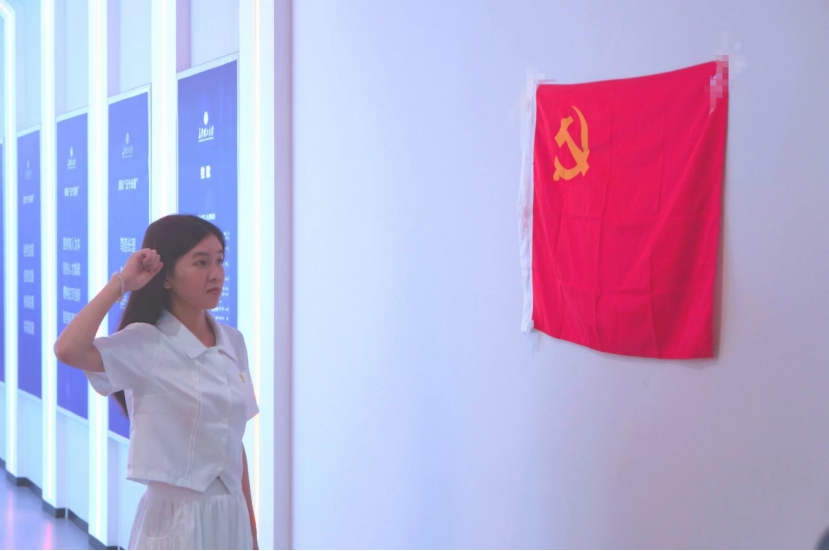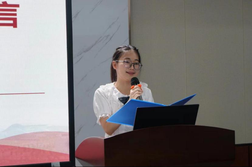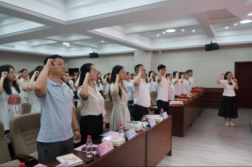 毕业生党员代表会计2003班陈思雅发言,她回顾了大学四年不断向党组织靠拢的过程以及所得所悟,并感谢母校与老师的培养使其实现成长的蜕变与思想的升华。除此之外,她还号召所有毕业生党员谨记教诲,时刻严格要求自己,不忘初心、牢记使命。随后,全体毕业生党员面向党旗重温了入党誓词。