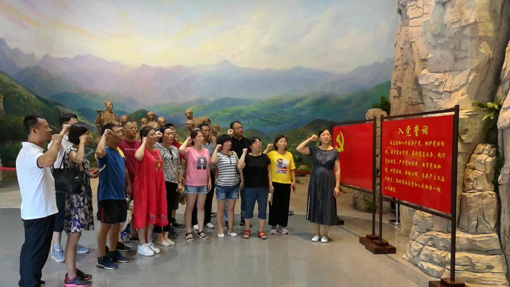 参观后,党员老师们聚在伟人塑像前,面对鲜艳的党旗,举起右手,又一次庄严宣誓:“我志愿加入中国共产党,拥护党的纲领……履行党员义务,执行党的决定,严守党的纪律……积极工作……随时准备为党和人民牺牲一切……”