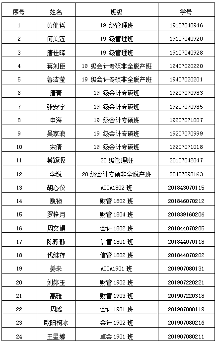 名单公示三个工作日(12月17日—12月21日) ,公示期间,如有异议,请实名向经济与管理学院学生工作办公室反映。联系电话: 0731 -85256095。