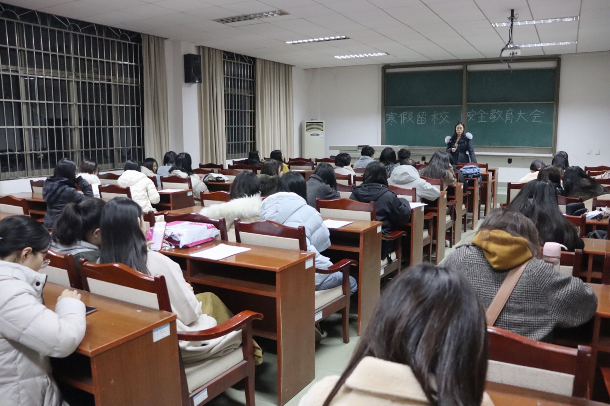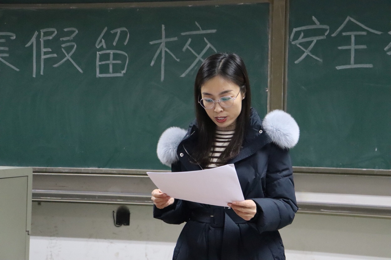 会议伊始,周路路向大家介绍了放假的注意事项,并公布了留校学生负责人名单以及各小组组长名单,提醒各位留校学生要遵守学校规章制度。接着,周路路指出寒假留校学生要严格遵守寒假作息时间和请假规定,服从学院管理安排。她鼓励留校学生在寒假生活中相互照应,希望留校学生能够明确目标,合理规划时间,结合自身实际制定合理的学习计划,争取学有所获。最后,周路路强调了寒假留校安全的重要性,指出留校学生要从思想上增强安全防范意识,注意防火、防盗、饮食卫生以及交通安全,杜绝各类安全事故的发生。她还分享了几个安全案例,让在场的同学们深刻地认识到了寒假留校安全的重要性。
