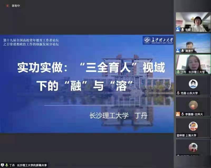 11月6日-7日,由《<思想教育研究》编辑部主办的第十九届全国高校青年德育工作者论坛隆重举行,我院党委书记丁丹受邀在第九分论坛“日常思想政治工作的创新发展”上做报告,报告主题为《实功实做:“三全育人”视域下的“融”与“溶”》。此次分论坛由北京科技大学马克思主义学院党委书记张颖主持,重庆大学马克思主义学院蒲清平教授点评。
