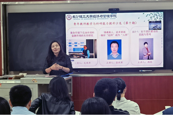 张跃军以“一个系统、两个转型、三种文章、四种精神、五种品格、六种信仰”为内容框架结合新时代改革开放和社会主义现代化建设新形势,习近平总书记重要讲话精神做了题为“铸魂育人,追求卓越——做好‘经师’成为‘人师’”的专题讲座。文凤华通过分析国际形势发展变化的形势,引用大量数据与青年教师们分享了“复杂环境下石油市场和金融市场的关系研究”这一课题的研究背景,基本框架,并最后得出“在熊市条件下,基于OVX的油价不确定性对中国股市整体和行业收益有显著负向影响”和“主要是油价不确定性的增加而不是油价不确定性的减少对中国股市收益产生影响”的结论。最后,韩艳从“搭平台,建团队实现 0-1”和“管好团队力争实现新突破”两方面的内容讲述了自己从“三无”到“三有”心怀感恩,做好规划、抓住机遇、踏实科研,最终带领团队取得多项奖励、荣誉称号的过程。分享结束后,与会的青年教师们就感兴趣的内容进行了提问与交流。