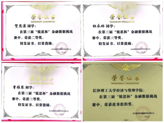 第三届锐思金融数据挑战赛于2022年3月31日正式启动,于5月中旬落下帷幕。本次比赛由LETOU体育平台经济与管理学院金融系和湖南省产教融合研究生联合培养基地“投资与财富管理研究生培养基地”联合组织。我院金融专业硕士贺思涛获二等奖,曾雅琴、杜永琳获三等奖,许苇坤获优秀参与奖,会计专业硕士钟婷婷获优秀参与奖。