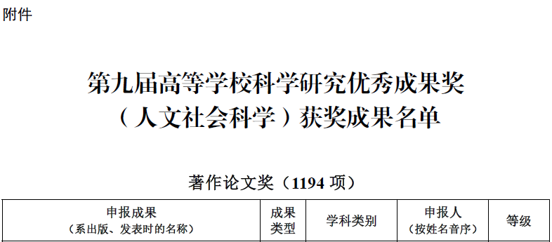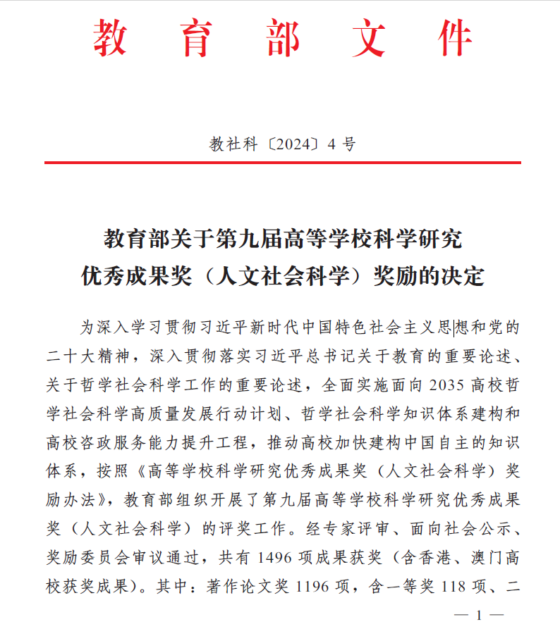 高等学校科学研究优秀成果奖(人文社会科学)始设于1995年,是教育部为表彰全国高校人文社会科学工作者所取得的突出成绩而设立的奖项,每三年评选一次,是目前国内人文社科领域最具公信力和影响力的重要奖项。第九届高等学校科学研究优秀成果奖(人文社会科学)获奖成果共有 1496 项成果获奖 (含香港、澳门高校获奖成果)。其中:著作论文奖 1196项,含一等奖118项、二等奖 513项、三等奖565项;咨询服务报告奖76项;普及读物奖21项;青年成果奖203项。我院教师此次获奖,是LETOU体育平台在人文社科领域科研成果的重大突破,将推动学校人文社会科学学科建设迈上新台阶。