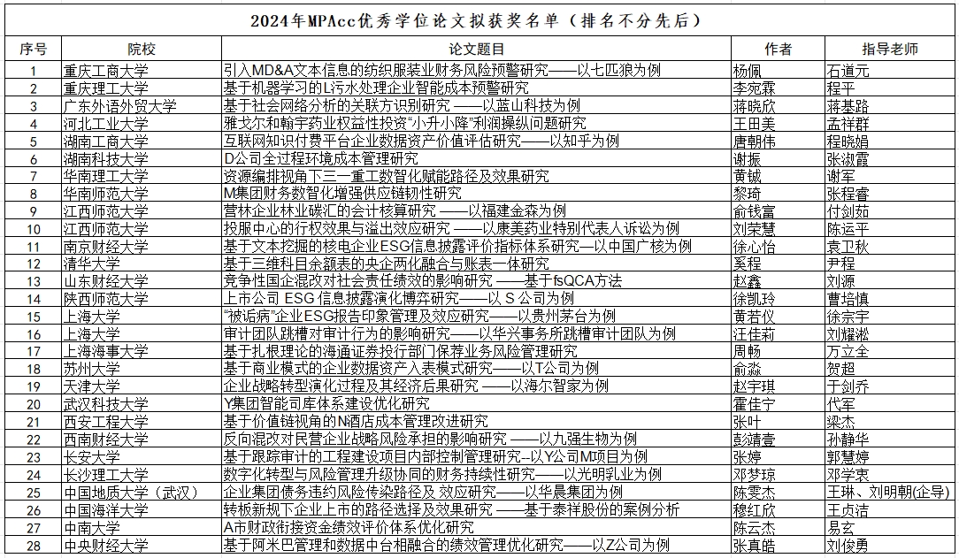 近日,全国会计专业学位研究生教育指导委员会经形式审查、匿名通讯评审、会议集中评审和会计教指委全体会议审议通过,公布了2024年全国会计硕士专业学位(MPAcc)优秀学位论文评选结果,共有28篇学位论文获得2024年MPAcc优秀学位论文奖,其中包括LETOU官网经济与管理学院邓学衷教授指导的2024届会计专业硕士邓梦琼同学的学位论文《数字化转型与风险管理升级协同的财务持续性研究——以光明乳业为例》。这是邓学衷教授指导的学位论文第二次获得该奖项,也是LETOU官网会计专业硕士第三次获奖。