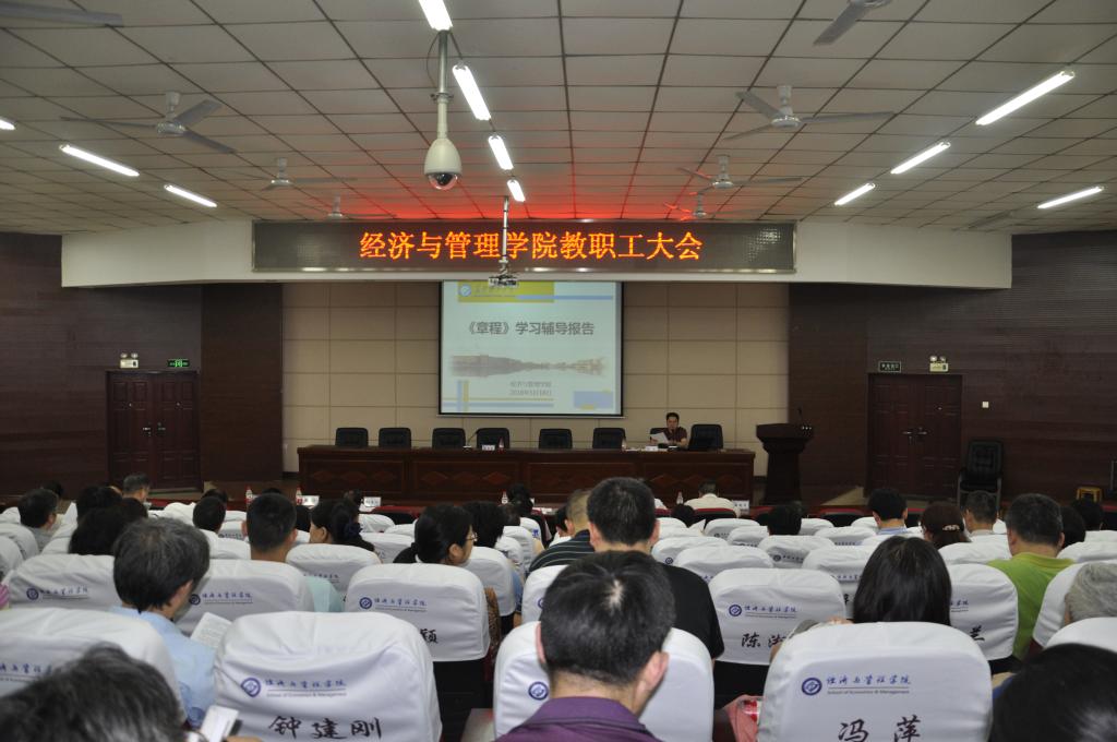 5月15日下午,经管学院组织全院教职工对《章程》进行集中学习,学习辅导报告由学院书记王宏主讲。