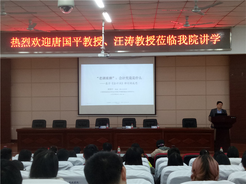 2018年11月6日晚上19:00,在云塘校区文科楼A200,来自中南财经政法大学教授、博士生导师唐国平为我院师生做了题为“老调重谈”----会计究竟是什么?的讲座。2016级、2017级会计系、企管系学生及部分教师代表200余人参加了讲座。院长陈银娥教授主持讲座。