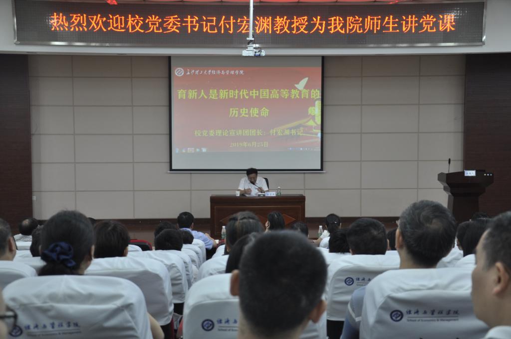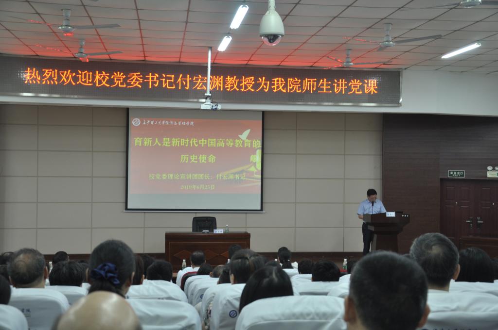 6月25日下午,校党委理论宣讲团团长、校党委书记付宏渊在七一建党节即将到来之际,专题为经管学院师生作了题为《育新人是新时代中国高等教育的历史使命》的精彩党课。校党委委员、宣传部部长方琼,经管学院全体教职工和部分学生党员代表近300人参加此次党课学习。