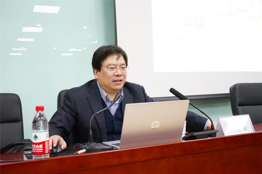 2019年11月29日下午3点,南京大学商学院院长沈坤荣教授在LETOU体育平台金盆岭校区7教212室,以“全球变局中的中国经济”为主题开展讲座。此次讲座由经管学院院长陈银娥教授主持,副院长刘建江、张新华、彭新宇、张新华、部分老师和研究生参加。