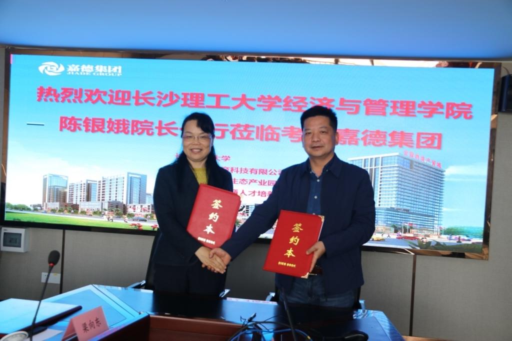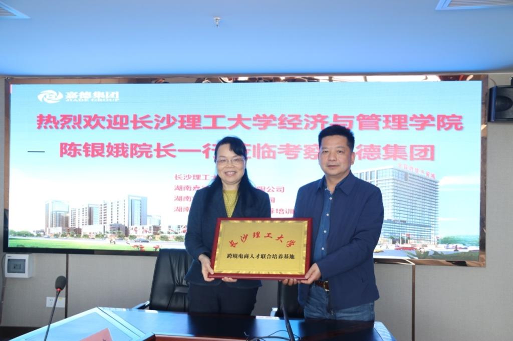 2020年4月14日, 陈银娥院长等一行赴湖南省跨境电商产业园,与湖南嘉德教育集团签订人才培养校区合作战略协议。湖南嘉德集团董事长彭伍军等集团领导出席签约仪式。