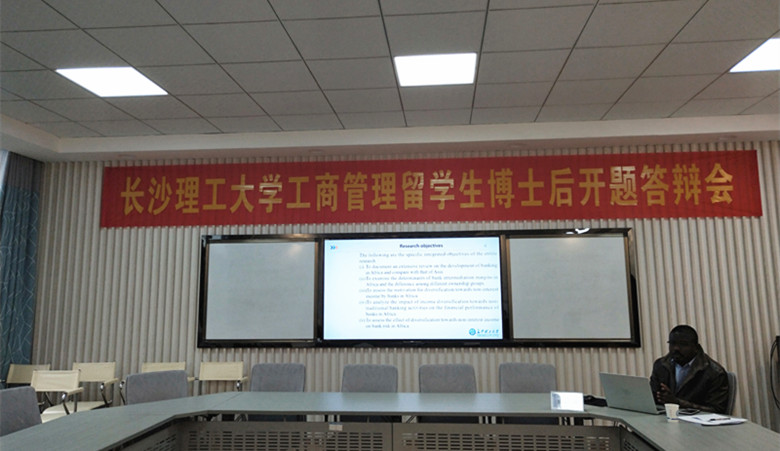 开题答辩会首先由合作导师唐文进教授介绍了Bismark博士的学习经历和博士后合作课题的选定背景,接着Bismark对自己的博士后选题《Research On The Income Diversification Of Banks In Developing Countries》内容进行了提纲挈领、简明扼要的汇报。与会专家认真听取了汇报并针对他的开题报告进行了质询,并就如何在博士后在站期间更好开展研究工作提出了指导性意见。答辩委员会经过讨论后认为:Bismark的博士后合作选题富有理论价值和现实意义,内容充实,思路清晰,方法科学,数据详实,工作量饱满,研究方案可行,一致同意通过进站开题答辩。