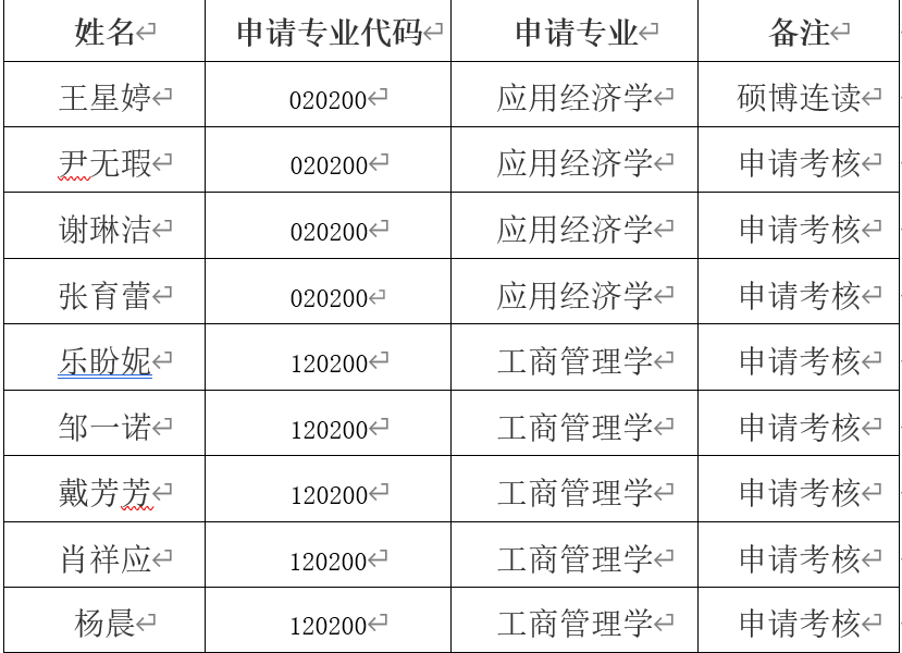 、《经济与管理学院2025年博士研究生第三批申请考核制招生工作实施方案》和《经济与管理学院2025年招收硕博连读博士研究生工作实施方案》等规定,经个人申请,学院审核,确认王星婷等9名同学符合经济与管理学院博士研究生报考初审资格(见下表),现予公示,公示期3天(6月6日-6月8日)。如有异议,请在公示期内反馈给学院研究生办公室,电话0731-85222806。