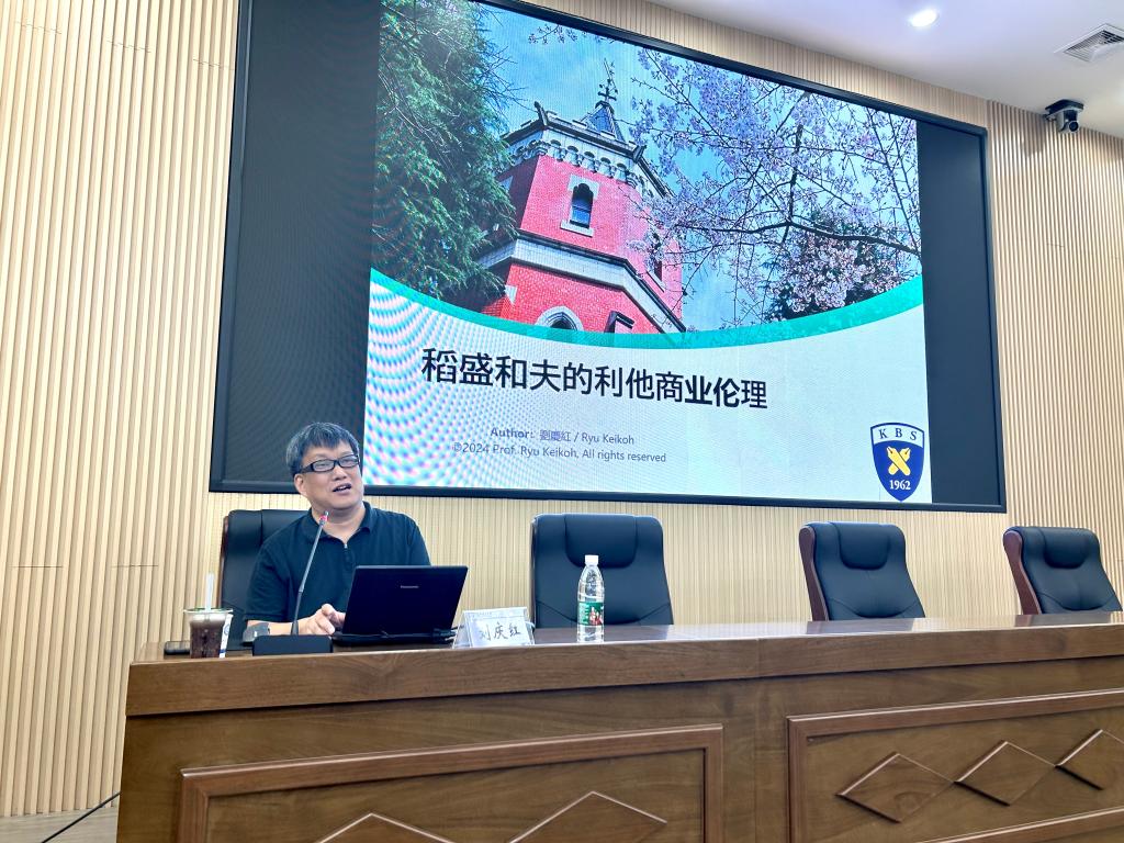 9月8日上午,在经管大楼100学术报告厅,日本庆应大学刘庆红教授应邀来学院主讲金岭学术大讲堂2024年第18期,主题为“稻盛和夫的利他商业理论”。校期刊社社长王宏、院长彭新宇出席,学院师生150余人参加了此次讲座,讲座由院长彭新宇主持。