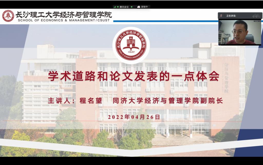 4月26日下午,同济大学经济与管理学院副院长、公共管理系系主任程名望教授做客我院青年教师教学与科研能力提升沙龙(第九期),为我院师生做了题为“学术道路与论文发表的一点体会”的讲座。讲座采取线上及线下相结合的方式进行,副院长王治、学院部分老师和研究生共计200余人聆听了报告。此次讲座由副院长彭新宇教授主持。