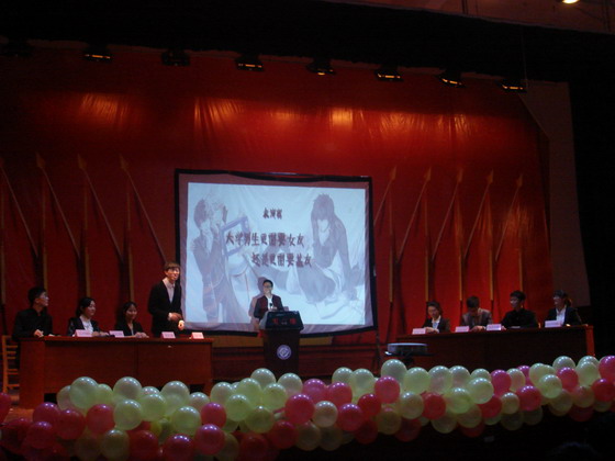 本次辩论赛分为上下两个部分进行。首先开始的是冠军争夺赛,由晋级决赛的两支队伍进行比赛。比赛正式开始前,大屏幕播放了一段视频,随机采访了一些同学,了解他们对“做慈善是高调好还是低调好”这一问题的看法。紧接着,比赛正式开始,辩论双方围绕“做慈善应该高调还是低调”的辩题展开激烈辩论。正、反方一辩分别根据己方观点立论,运用各种事例条理清晰地阐明观点。随后的攻辩环节,正反双方分别针对对方的观点提出反驳意见,参加辩论的双方队员你来我往、唇枪舌战,现场辩论气氛紧张而激烈。自由辩论环节的气氛更趋白热化,观众们被双方队员的精彩争辩吸引,一阵比一阵热烈的掌声与叫好声将现场气氛推向了高潮。最后的总结阶段,正反双方的四辩在批驳对方观点的同时,围绕己方的观点进一步深入阐述,坚持己方立场。辩论环节结束后,现场评委和正反双方的观众还向两支队伍分别提问,双方队员站在各自立场上结合己方辩词作了解答。