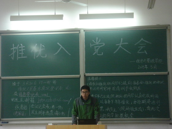 为进一步规范我院推荐优秀团员入党工作,经管学院于3月30日中午1:00在文科楼D101教室举行了推优入党大会。本次会议由我院分团委学生会组织部副部长刘秋菊主持,我院12、13级各班团支书参加了本次会议。