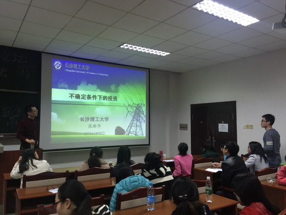 11月18日晚上7:30,经管学院在7教110教室开展了博力学术论坛系列讲座的第一场讲座——“信息不确定条件下的投资决策”,讲座特邀我院副院长张新华教授为同学们进行了实施投资相关问题方面的探讨。 张老师作为许多重要期刊论文的第一作者,他并没有用很高深的学问开头,而是通过调侃自己的家乡口音,做了一个轻松的开场白,并运用一个简单的投资案例引出了NPV(Net Present Value),即净现值的概念。张老师提到,NPV没有考虑到投资的机会成本,它假定以后再也没有投资是可逆的,实践中许多投资是不可逆的或者部分不可逆的,“等一等”再做决策往往是规避投资风险的一种方法。 除了介绍不确定条件下的NPV,张老师还介绍了实物期权理论的发展及其应用、等待投资的价值和MC(Monte Carlo)方法来进行NPV的计算和投资决策的选择。之后张老师还给我们演示了他发表在中国管理科学上的论文《寡头发电商投资阈值与容量选择模型及其分析》中的公式,张老师深入浅出的为我们讲解了信息不确定条件下的投资决策等问题。最后的师生交流提问环节,同学们积极提问了投资时间和金额的选择问题,张老师就现实情况中的各种因素热心解答,至此整个讲座就此完美落下帷幕。 本次讲座为同学们打开了视野,丰富了更多知识,张老师的讲解内容引人入胜,吸引眼球,达到了理想的讲座效果,为接下来的博力学术论坛系列讲座开了个好头,相信接下来的讲座会越办越好!