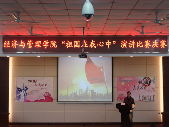 12月29日晚上19:00,经管学院“祖国在我心中”主题演讲比赛决赛在文科楼A200举行。本次比赛是学院2015-2016年度“祖国在我心中”主题教育的重要组成部分,由经管学院关工委主办,分团委学生会承办,历时13天,经过初赛、复活赛层层选拔,最终8位选手进入决赛。经管学院党委副书记、关工委主任彭玉楼,关工委常务副主任陈均杰,分团委书记、关工委秘书陈钰汀,15级辅导员龙攀,朝闻道演讲协会陈伟涛、李咏霞,萌泉辩论队王艺萌受邀作为嘉宾和评委,经管学院分团委学生会主席团、15级20位大众评审及15级学生代表观看了比赛。     关工委常务副主任陈均杰老师致开幕词,陈老师表示举办本次活动,是为了培养同学们以爱国主义为核心的民族精神,展现同学们朝气蓬勃、积极向上的精神风貌,希望各位同学们努力学习专业知识,将来学有所成报效祖国。此次决赛共由三个环节组成:自我介绍,命题演讲以及即兴演讲。最终成绩以专业评委及大众评审综合评判作为考量,并同时进行最佳人气奖网络投票。随着大屏幕倒计时数字的变换,比赛正式开始,8位选手依次亮相,以自制PPT作为背景,进行1分钟的自我介绍,并宣读了自己的比赛宣言。第二环节为命题演讲环节,8位选手以“祖国在我心中”为主题,按赛前抽签顺序依次进行了3分钟的立式脱稿演讲。他们或激情澎湃,或深情款款,用心灵深处的真实情感去表达自己的满腔爱国情怀。对于每位选手的表现,评委们依次进行了专业性、针对性的点评,并给出评判,加以大众评审的投票数,综合一、二轮成绩,6位选手跻身最后环节。期间,大屏幕播放了选手们的加油视频,给予紧张的选手们一份慰藉与鼓励。比赛进入最后冲刺阶段,6位选手依次抽选题号,进行了为时两分钟的即兴演讲。选手们在30秒钟的准备时间后,便开始了各自主题的演讲,选手们都台风稳健,陈述清晰,并通过互动来调动全场气氛,对于主题,更是加以实事案例进行佐证支撑,提及钓鱼岛事件,九八五砸车事件,以及最近火热的日本马桶事件;除此外,选手们还谈及了“为中华之崛起而读书”,并表达着自身的满腔激情。正如评委所言 “选手们总体水平很强,但演讲技巧方面有待进一步提高,希望大家可以通过观看演讲视频等方式得到进步,更加希望大家今后可以更加积极的参与主题演讲”。 最终吴俊萍获得一等奖,张学智、羊思宇获二等奖,沉芝羽、周金穗获三等奖。选手吴俊萍赛后感言:“我只是抱着尝试的心态来参加比赛,抒发自己的爱国情况,没想到会有这么好的成绩,我的经验还不够充足,我的准备也不够充分,但我会在之后努力改进,做一名优秀的演讲者。”此次活动旨在庆祝抗日战争暨世界反法西斯战争胜利70周年,培养同学们的民族精神,同时也为在演讲方面有特长的同学提供了一个更广阔的展示平台和锻炼自己的机会。