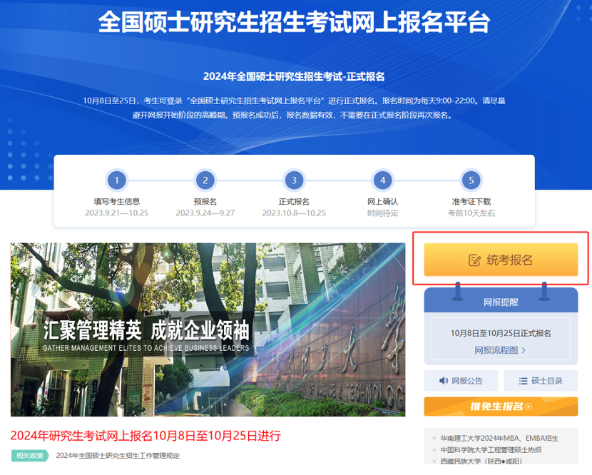(一)网上报名:1.报名时间:2023年10月8日至10月25日,每天9:00-22:00。2.请在规定时间登录“中国研究生招生信息网”(以下简称“研招网”)浏览报考须知,并按教育部、省级教育招生考试机构、报考点以及报考招生单位的网上公告要求报名。公网网址:https://yz.chsi.com.cn教育网址:https://yz.chsi.cn3.考生应当认真了解并严格按照报考条件与相关政策要求填报志愿及选择报考点。因不符合报考条件及相关政策要求造成后续不能网上确认、考试(含初试和复试)或录取的,后果由考生本人承担。4.报名期间,考生可自行修改网上报名信息或重新填报报名信息,但每位考生只能保留一条有效报名信息,逾期不再补报,也不得修改报名信息。5.报名期间将对考生学历(学籍)信息进行网上校验。考生可上网查看学历(学籍)校验结果,未能通过学历(学籍)网上校验的考生,必须在网报结束前完成学历(学籍)核验。