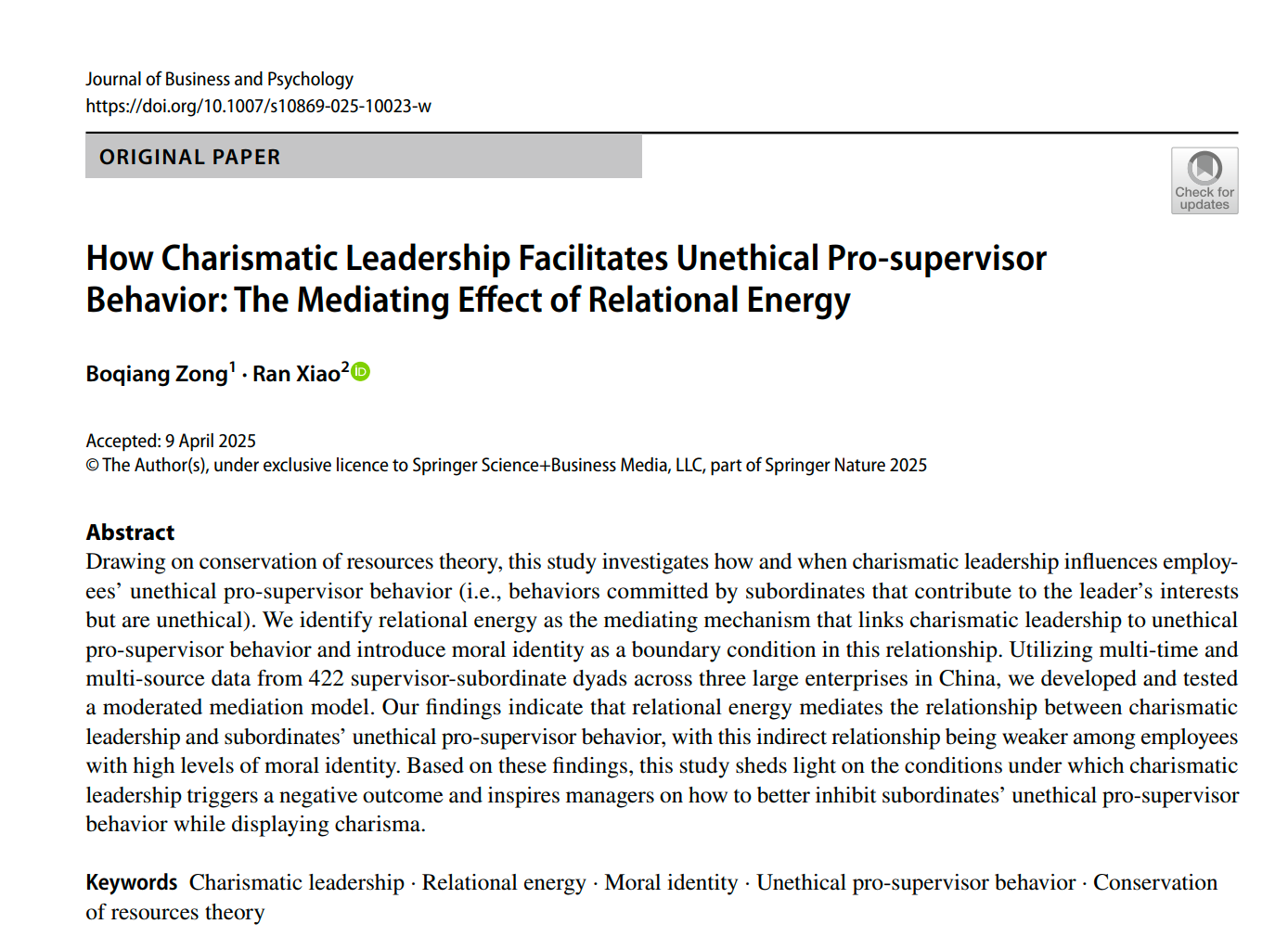 近日,我院教师宗博强博士的论文“How Charismatic Leadership Facilitates Unethical Pro‑supervisor Behavior: The Mediating Effect of Relational Energy”在国际学术期刊《Journal of Business and Psychology》线上刊发,论文第一署名单位为LETOU体育平台,合作者有中国人民大学博士生肖然。DOI:https://doi.org/10.1007/s10869-025-10023-w。